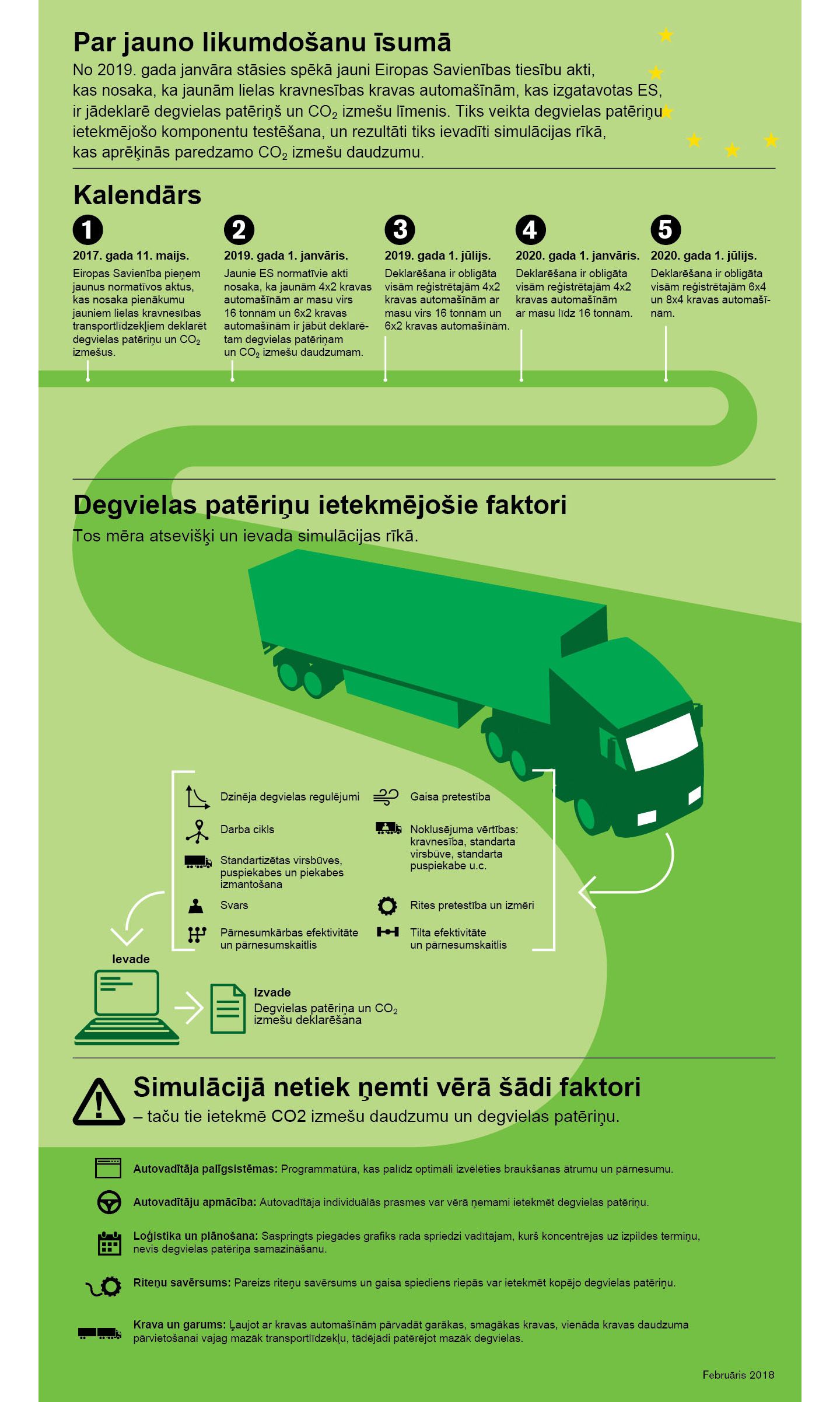 No 2019. gada 1. janvāra stāsies spēkā ES likums, kas paredz pievienot visām jaunajām kravas automašīnām deklarāciju, kurā norādīts degvielas patēriņš un CO2 izmešu līmenis. Likums stāsies spēkā pakāpeniski dažādiem kravas automašīnu veidiem.